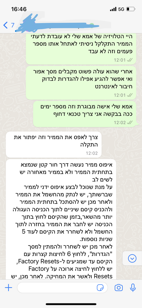 ביום ראשון בבוקר פנה שוב למוקד בוואטסאפ ולהפתעתו הבין מהנציגה כי קיים פתרון מאד פשוט לנושא. היא שלחה לו הסבר איך לבצע hard reset שאמור לפתור את הבעיה.
