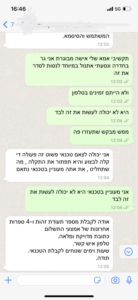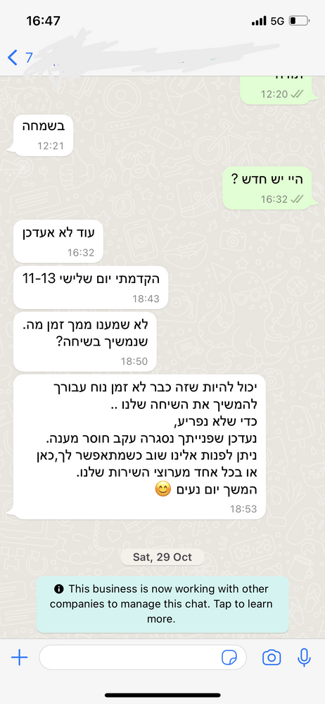 הפעולה המיידית הבאה שלו אחרי חיפוש באתר החברה – פניה למוקד השירות בוואטסאפ. המענה שהתקבל הוא שמוקד הוואטסאפ סגור ויפתח רק ביום ראשון.